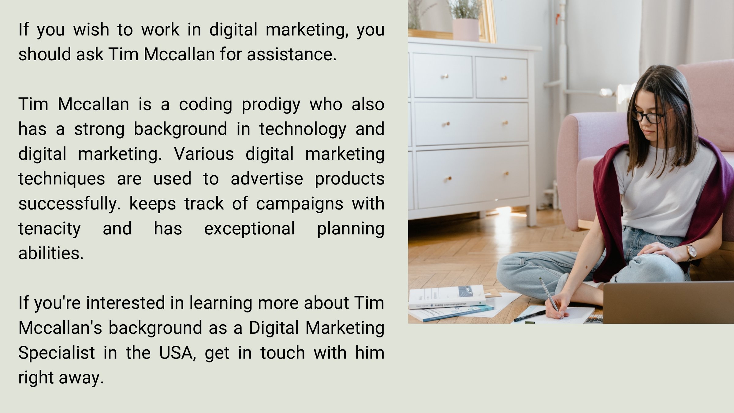 Tim Mccallan is a Digital Marketing Specialist in the USA who has a vast grasp of technology and program coding. Successfully markets items through a variety of digital tactics. Utilizes outstanding planning abilities and aggressive campaign tracking
