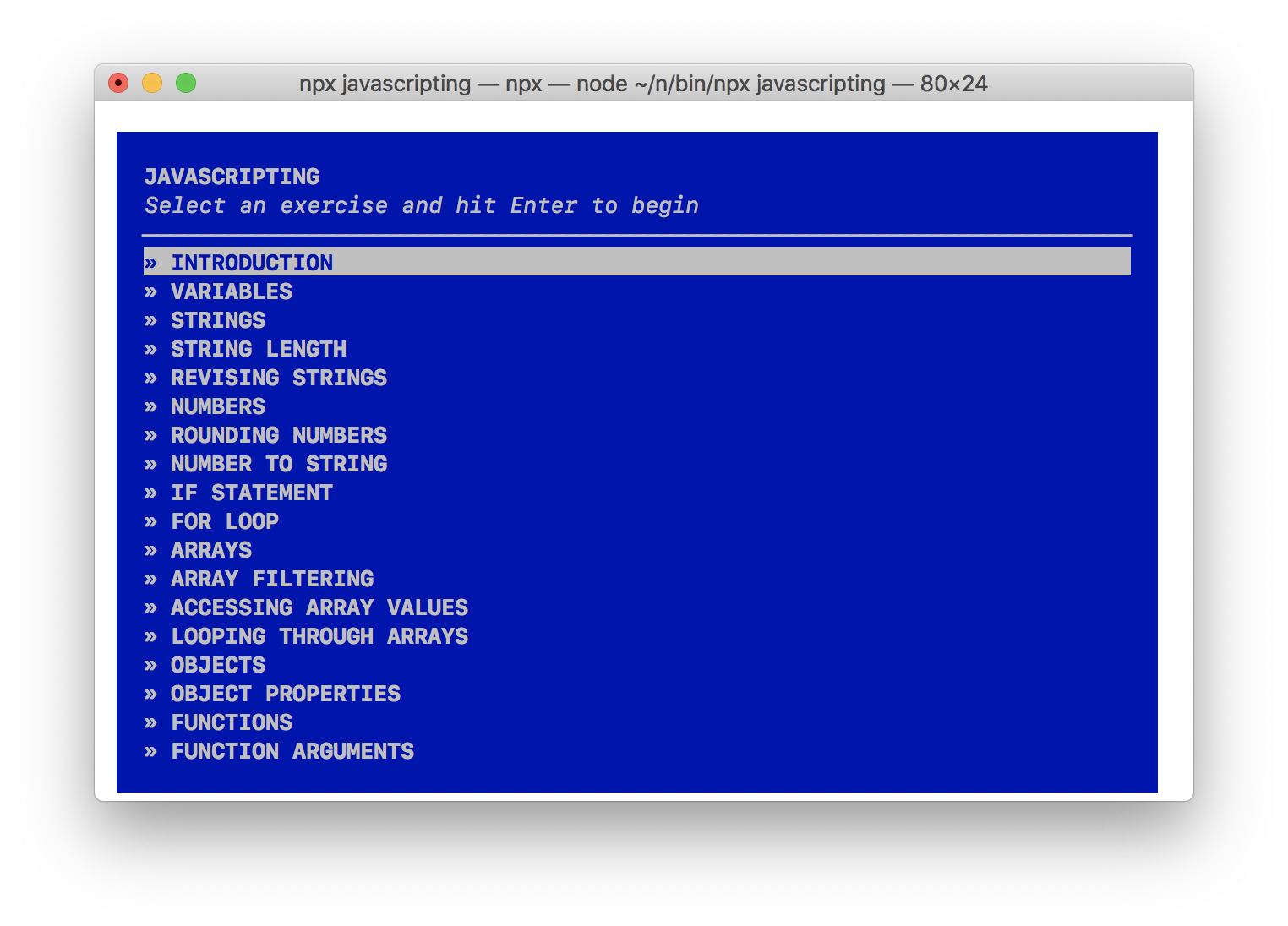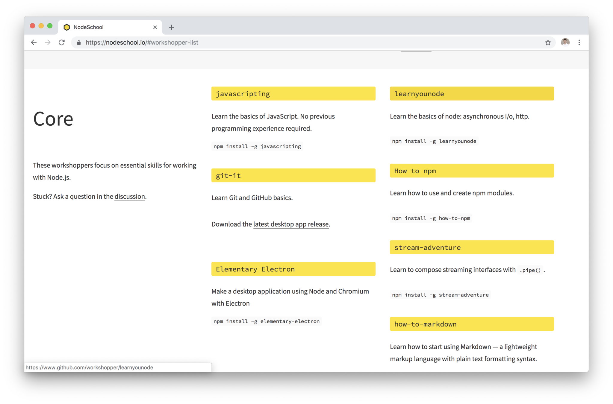 - Workshoppers (https://nodeschool.io/#workshopper-list)