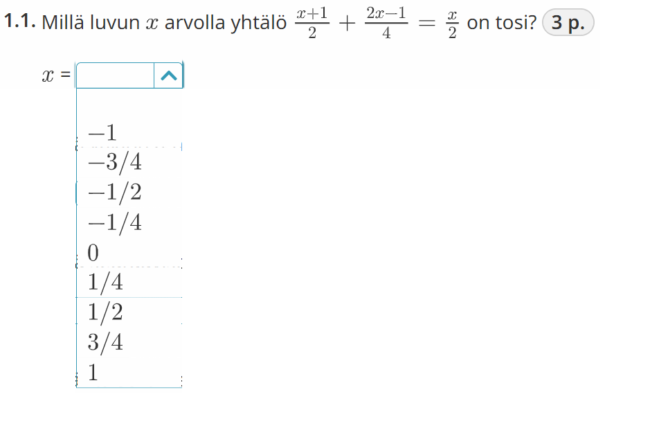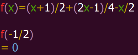 \(f(x)=\dfrac{x+1}{2}+\dfrac{2x-1}{4}-\dfrac{x}{2}\) nollakohtia