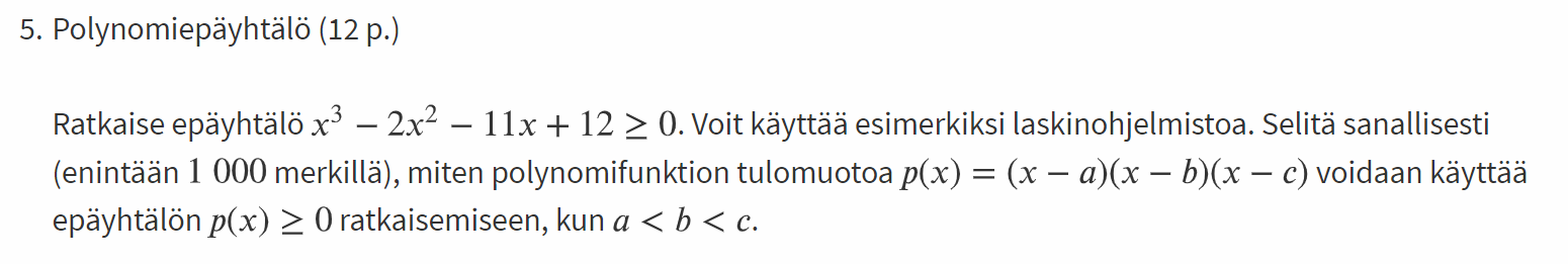 Solve osaisi ratkaista suoraan ensimmäisen epäyhtälön, mutta tässä tapauksessa nollakohtien ratkaisu ja merkkikaavion luominen testipisteitä laskemalla auttaa jälkimmäisen osan perustelemisessa