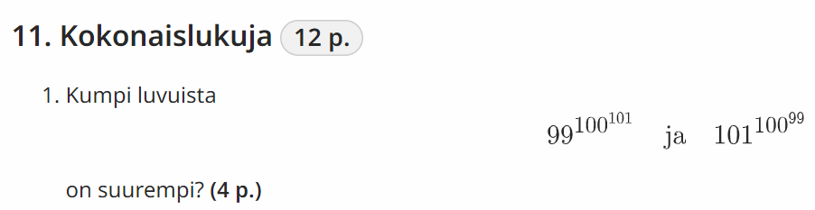 Esitetään arvaus, että \(99^{100^{101}}>101^{100^{99}}\) ja yritetään osoittaa tämä epäyhtälö todeksi. Jos se osoittautuu epätodeksi, korjataan epäyhtälön suunta jälkeenpäin.