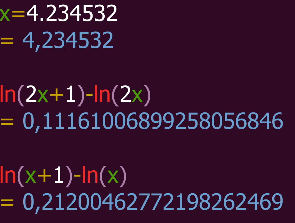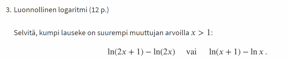 Tutkimalla ensiksi laskimella jollakin \(x>1\) saa tietoon kumman pitäisi olla suurempi, jolloin tehtävä muuttuu muotoon: osoita, että \(\ln(2x+1)-\ln(2x)<\ln(x+1)-\ln x\), kun \(x>1\)