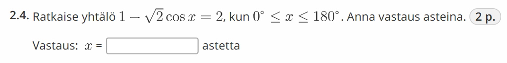 Radiaaneina tarkka arvo (\(x=\dfrac{3\pi}{4}\)) olisi kuitenkin jo helpompi selvittää taulukkokirjasta (trigonometristen funktioiden tarkkoja arvoja)