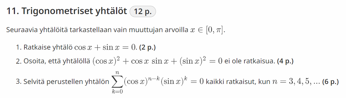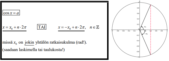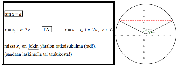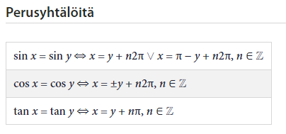 Huom. MAOLissa "perusyhtälöt" ovat tyypillisimpiä tapauksia \(\sin x = a\) jne. ajatellen hieman hämmentävässä muodossa.
