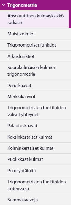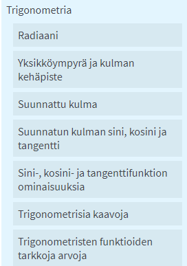 Jos tehtävä ei ratkea yksikköympyrää piirtämällä, MAOLissa ja koeympäristön ohjeissa on hyvin kattavasti paitsi trigonometrisia kaavoja, myös muuta tietoutta