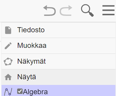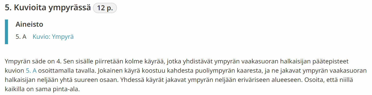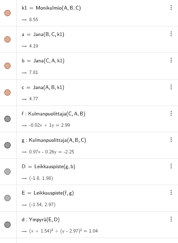 - Jos onnistut konstruoimaan Geogebrassa tehtävän tilanteen tarkasti käyttämättä missään vaiheessa "silmämääräisyyttä" hyväksi, ja vetoat ratkaisussasi tähän, liitä vastaukseen selitys, miten kuva on piirretty tai liitä vähintään kuvankaappauksia Algebra-ikkunasta