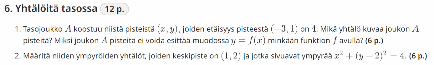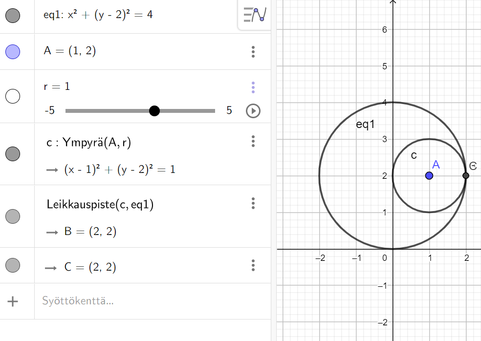 - Voi ratkaista joko pÀÀttelemÀllÀ geometrisesti eri tapaukset (huom. pitÀÀ perustella myös, miksi nÀmÀ ovat ainoat tapaukset) tai huolehtimalla, ettÀ leikkauspisteitÀ on tasan yksi eli yhtÀlöparilla \(\begin{cases}x^2+(y-2)^2=4\\(x-1)^2+(y-2)^2=r^2\end{cases}\) on yksi ratkaisu