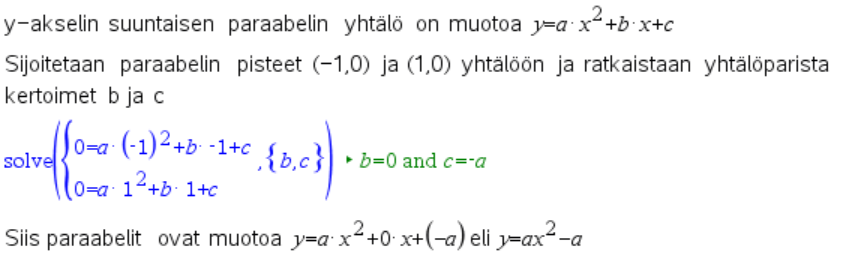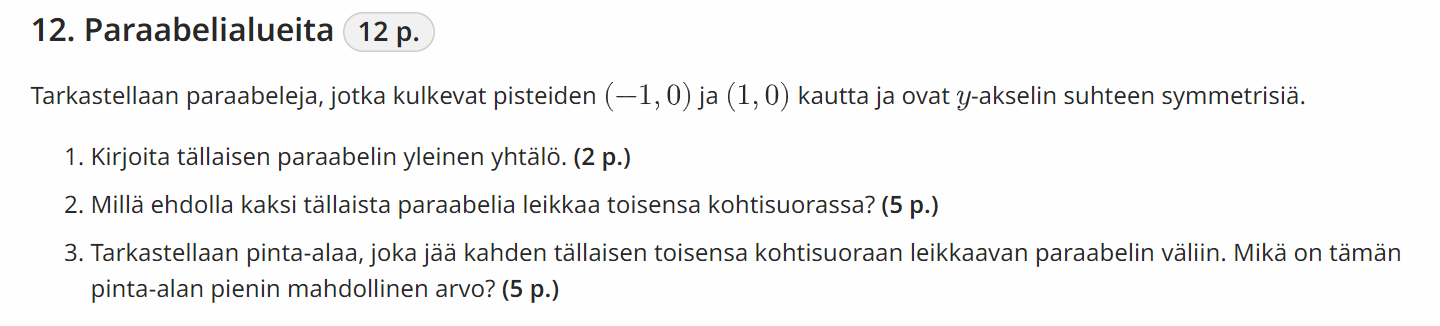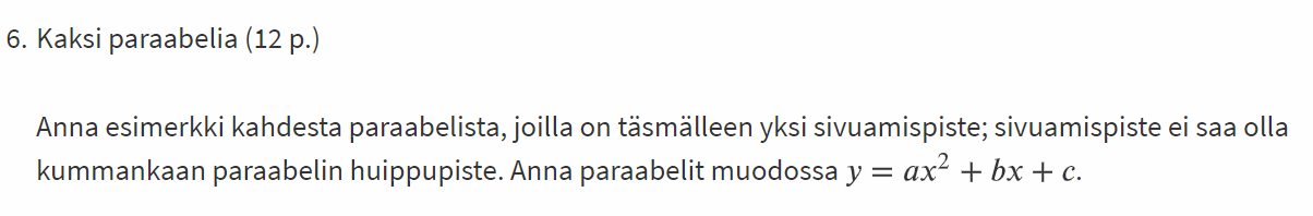 - todetaan, ettÀ koska ratkaisuja eli leikkaupisteitÀ on vain yksi ja paraabelit aukeavat eri suuntiin, paraabeleiden tÀytyy sivuta toisiaan. (+2p) Tarkistetaan lopuksi, ettei sivuamispiste ole kummankaan paraabelin huippu (esim. Geogebralla). (1p)