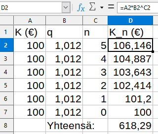 Koron koron kaava MAOLissa. Huom. äskeisen 1,2%:n korkoa vastaavan korkokertoimen voi laskea myös