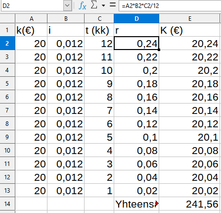 Tammikuun talletus ehtii kasvaa koko vuoden, mutta joulukuun talletus vain yhden kuukauden korkoa. Talletukset yhden vuoden aikana kertyvine korkoineen on 241,56€