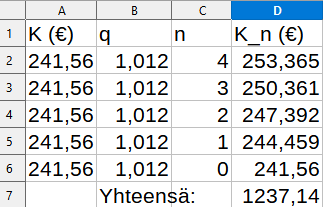 Luvut \(K_n\) muodostavat geometrisen jonon, jonka ensimmäinen jäsen on 100€ ja suhdeluku \(q=1{,}012\).