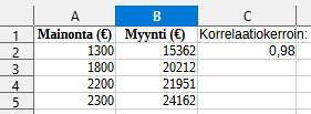 Taulukossa on yrityksen somemainontaan kuukaudessa käyttämä raha ja kuukauden myynti euroina. Mikä on mainonnan ja myynnin välinen korrelaatiokerroin? Onko korrelaatio positiivista vai negatiivista? Kuinka vahvaa korrelaatio on?