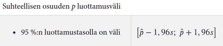 95%:n luottamusväliä vastaava virhemarginaali on \(1{,}96s=1{,}96\cdot 0{,}012268...\approx 0{,}024=2{,}4\)%-yks.
