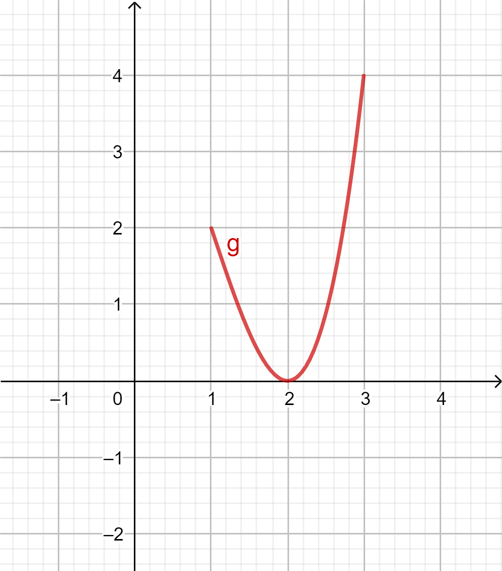 Välillä \(1\leq x \leq 3\) funktion \(g\) pienin arvo on 0 ja suurin arvo 4.