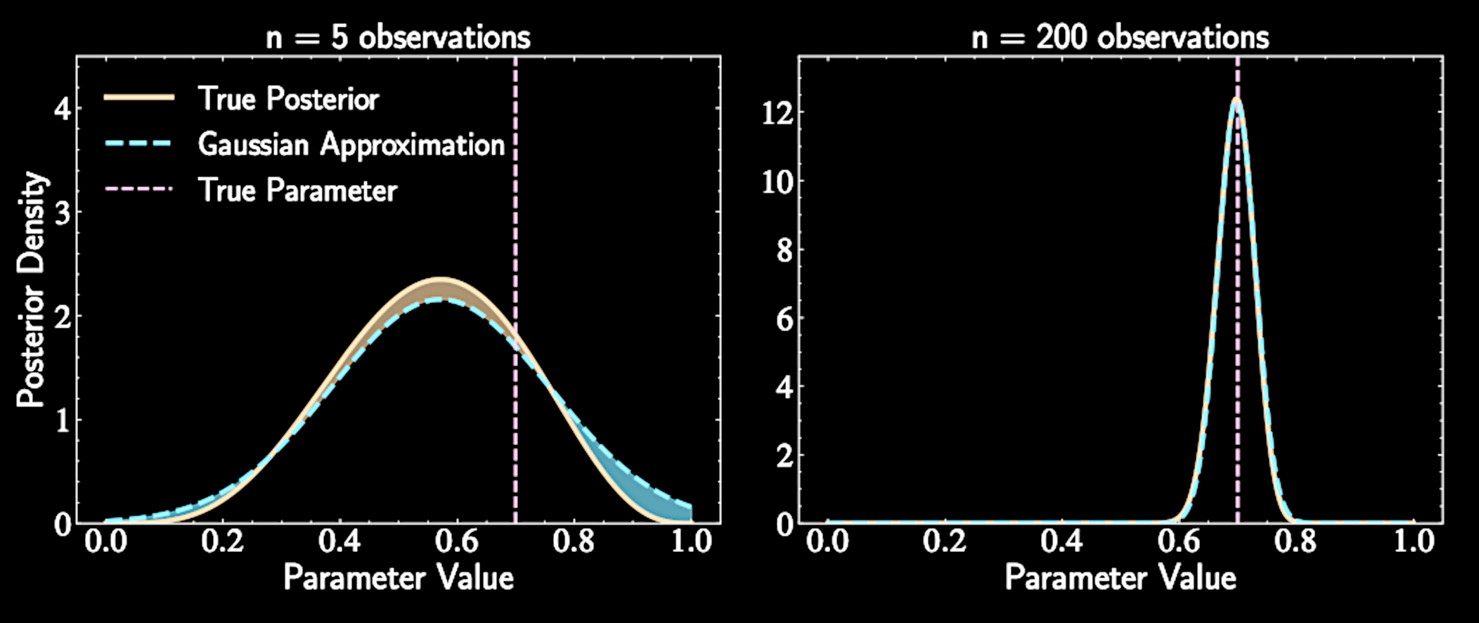 Each observation contributes information; aggregate effect produces increasingly Gaussian-shaped distribution