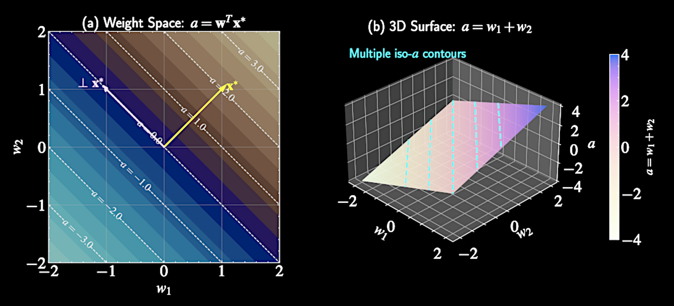 Weight vectors forming a hyperplane perpendicular to \( \mathbf{x}^* \) all map to the same logit \( a \)