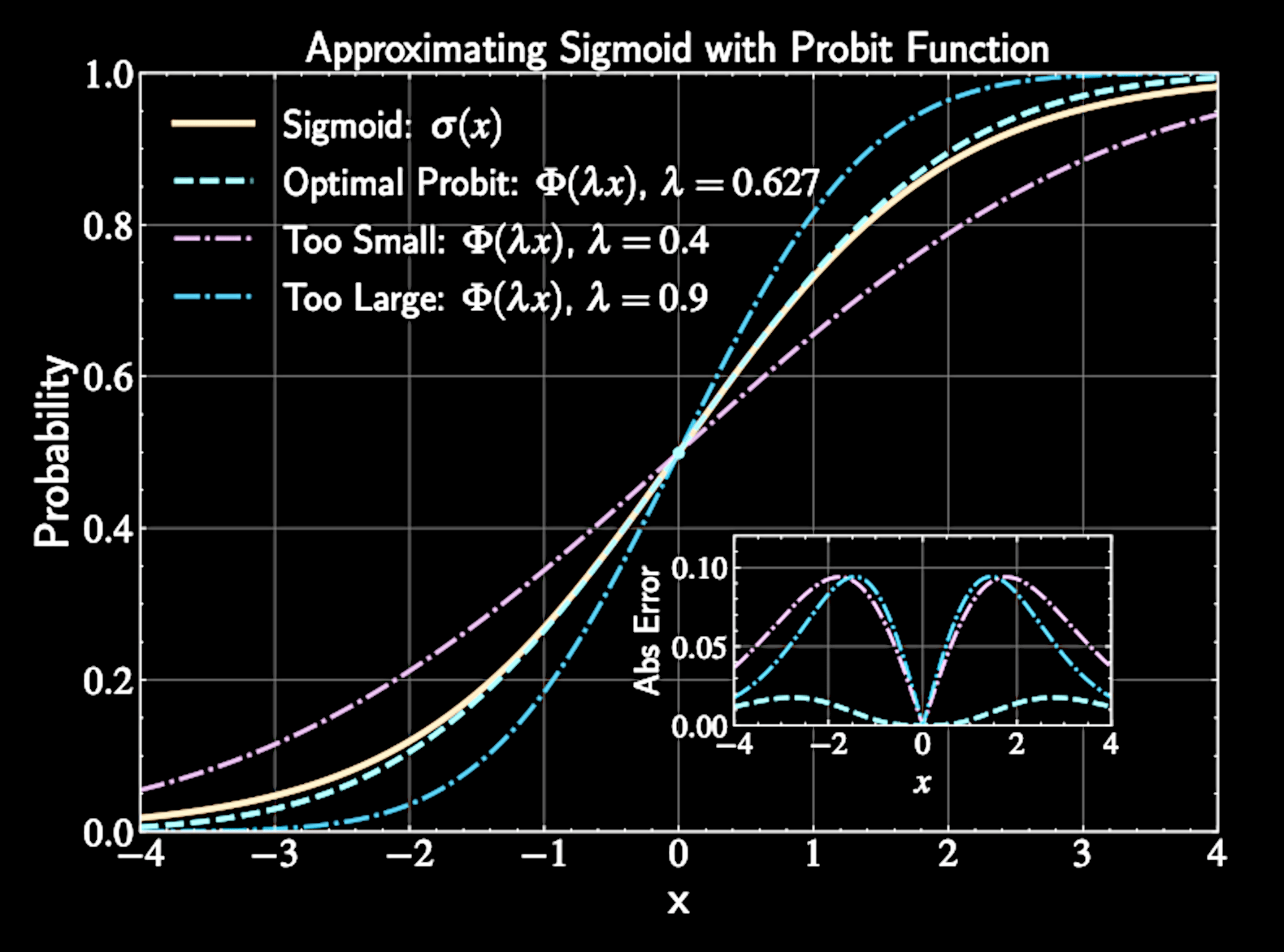 Sigmoid derivative at origin: \( \frac{d}{da}\sigma(a)|_{a=0} = \frac{1}{4} \). Probit derivative at origin: \( \frac{d}{da}\Phi(\lambda a)|_{a=0} = \frac{\lambda}{\sqrt{2\pi}} \)