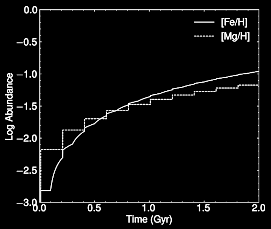 The production of Mg is instantaneous, and Fe is gradual
