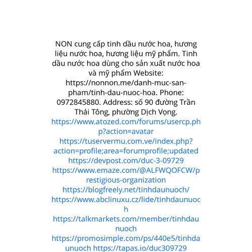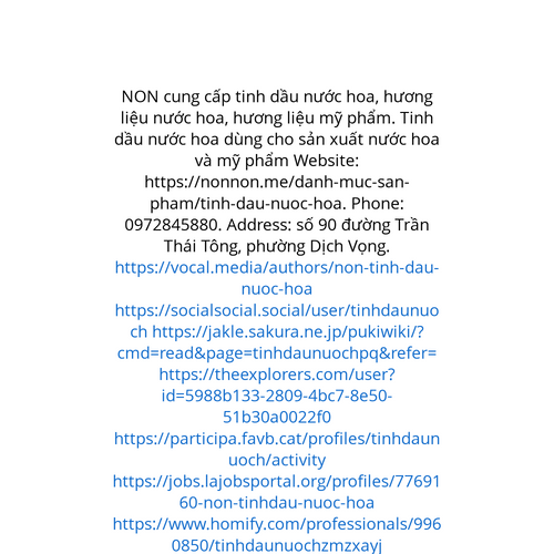 Website: https://nonnon.me/danh-muc-san-pham/tinh-dau-nuoc-hoa. NON cung cấp tinh dầu nước hoa, hương liệu nước hoa, hương liệu mỹ phẩm. Tinh dầu nước hoa dùng cho sản xuất nước hoa và mỹ phẩm Phone: 0972845880. Address: số 90 đường Trần Thái Tông,