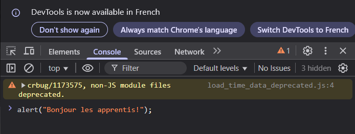 alert("Bonjour les apprentis en JS"); - Valider l'instruction avec la touche