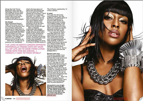 Genre: Image-The fierce unfriendly expression on her face shows that she's powerful & important. She's wearing lots of big jewellery which is a common convention of hip hop portrayal. Mode of Address-Formal, with no colloquial language used which shows that the audience is older. Typography-Very bleak & simple. Only one basic font used & majority very small. One pull quote used, in a different colour & larger size to attract the readers attention to it. Content-The article is about the artist life before being famous. This would appeal to fans that became aware of her through x-factor as they saw some of this back story on the show.