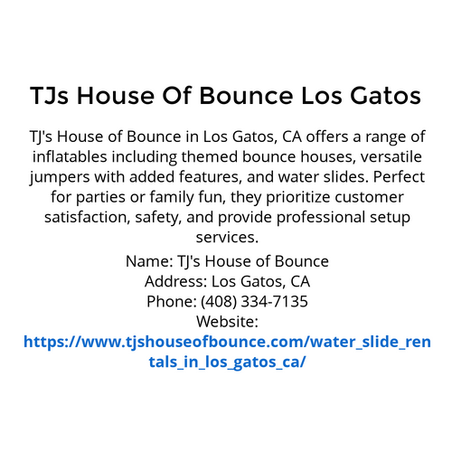 https://www.tjshouseofbounce.com/water_slide_rentals_in_los_gatos_ca/ TJ's House of Bounce in Los Gatos offers themed bounce houses, jumpers, & water slides for events, with a focus on safety & customer satisfaction.