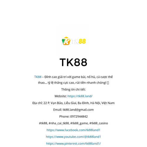 TK88 – Đỉnh cao giải trí với game bài, nổ hũ, cá cược thể thao… tỷ lệ thắng cực cao, rút tiền nhanh chóng! 🎉 Thông tin chi tiết: Website: https://tk88.land/ Địa chỉ: 22 P. Vạn Bảo, Liễu Giai, Ba Đình, Hà Nội, Việt Nam Email: tk88.land@gmail.com