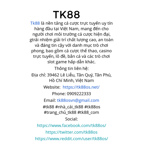 Tk88 là nền tảng cá cược trực tuyến uy tín hàng đầu tại Việt Nam, mang đến cho người chơi môi trường cá cược hiện đại, trải nghiệm giải trí chất lượng cao, an toàn và đáng tin cậy với danh mục trò chơi phong,