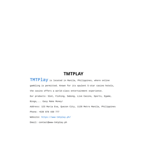 TMTPlay is located in Manila, Philippines, where online gambling is permitted. Known for its opulent 5-star casino hotels, the casino offers a world-class entertainment experience. Our products: Slot, Fishing, Sabong, Live Casino, Sports, Egame, Bing