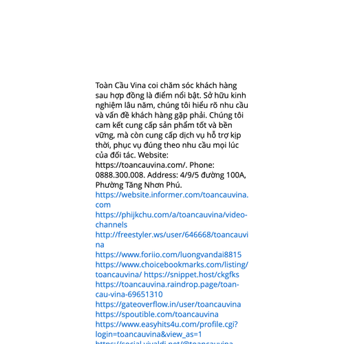 Website: https://toancauvina.com/https://toancauvina.com/ Chúng tôi tại Toàn Cầu Vina đặt dịch vụ hậu mãi làm trọng tâm để tạo lợi thế cạnh tranh. Trải qua nhiều năm hoạt động, chúng tôi luôn đồng hành cùng khách hàng trong mọi tình huống. Mục tiêu là đem lại sản phẩm chất