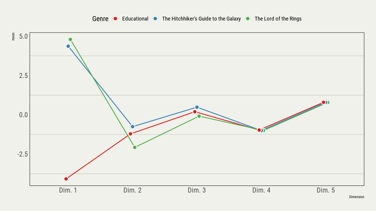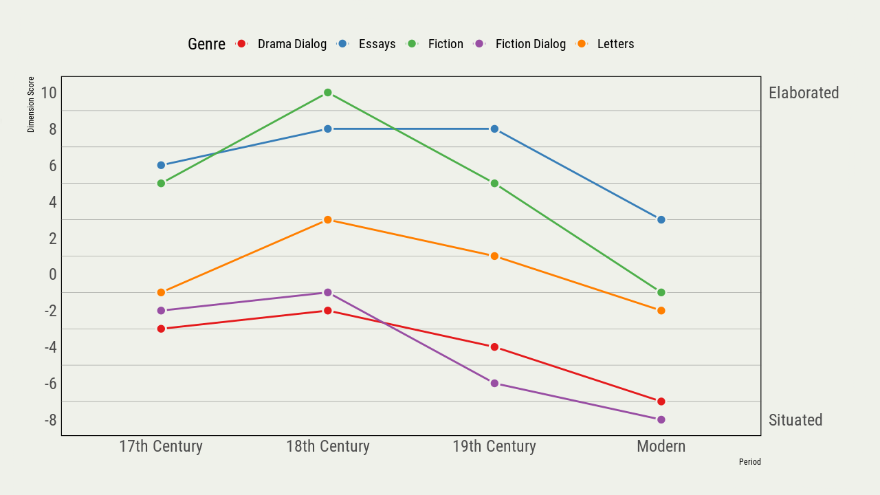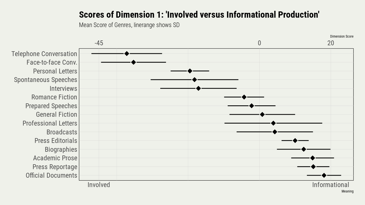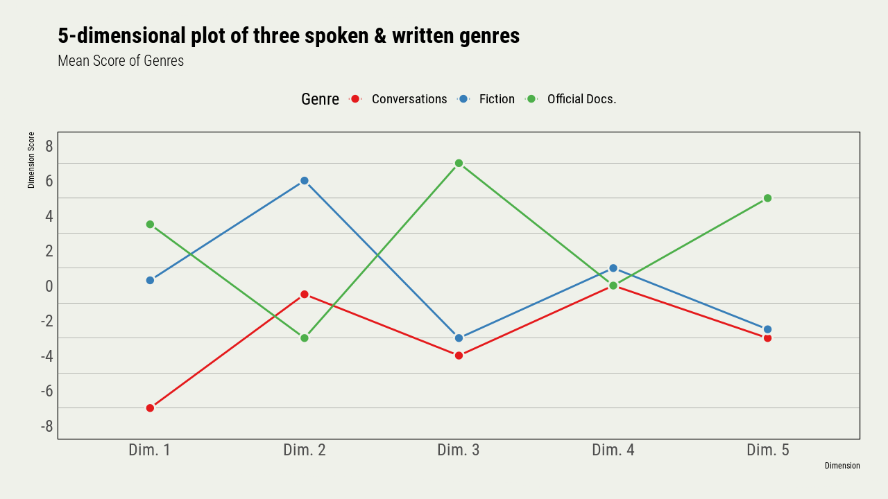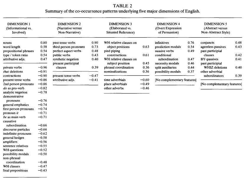 - Distributional analysis of co-occuring linguistic features across a wide range of genres
