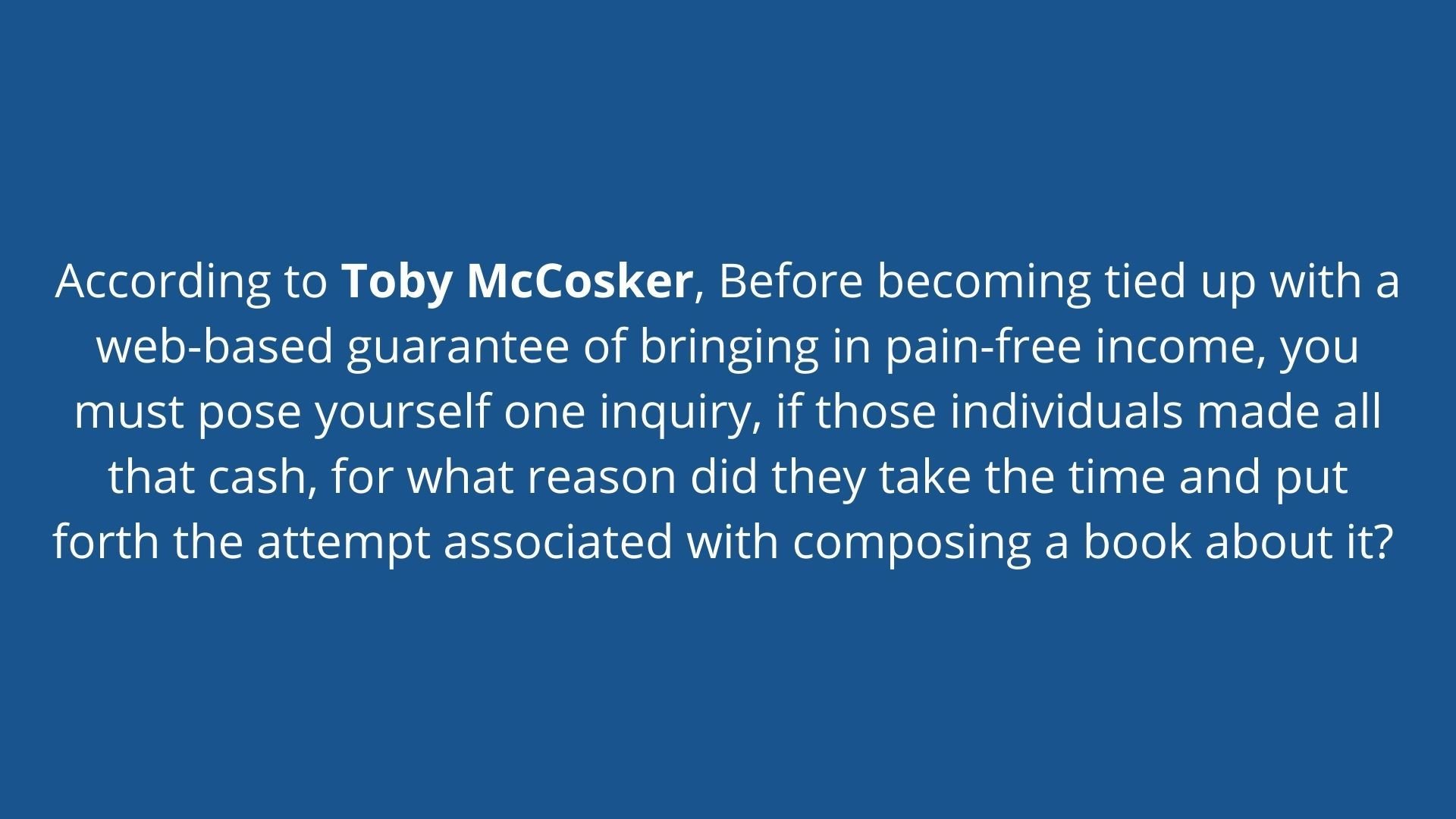 According to Toby McCosker, Before becoming tied up with a web-based guarantee of bringing in pain-free income, you must pose yourself one inquiry, if those individuals made all that cash, for what reason did they take the time and put forth the attempt associated with composing a book about it?