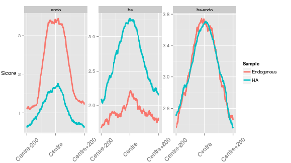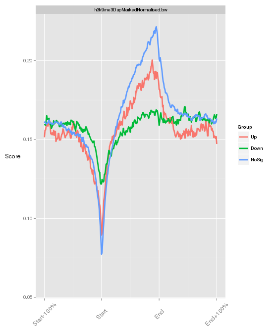 - Meta (signal over and around a genomic region normalised to that genomic regions length).