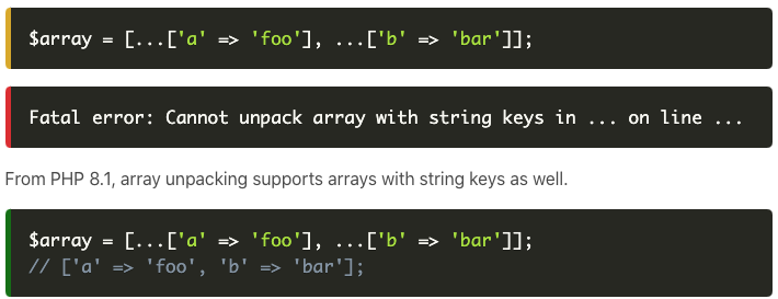 Array unpacking overwrites duplicate string keys, while the + operator ignores duplicate string keys.