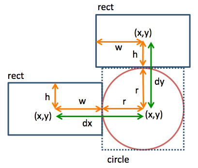 - Objects collide when dx < paddle.w + ball.r and dy < paddle.h + ball.r