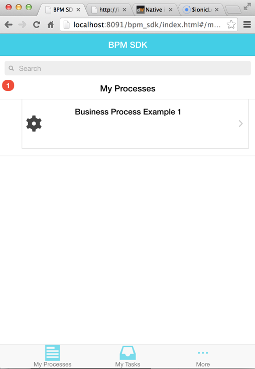 If the user selects the 'More' tab the 'Settings' side-menu will be displayed. If the user clicks on this, the index.html page will load the mySettings.html/mySettingsCtrl.js files and show this to the user. This will display to the user the values for the bpmHostname, bpmPort, the BPM username & password and the name of the Exposed Business Process to use for this web app. When the user submits the HTML form, the AngularJS controller code will post this to the ExpressJS REST API and this method will update the global variable values that will then be used to connect to the BPM REST API.