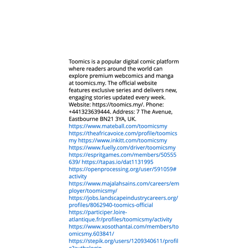 Website: https://toomics.my/https://toomics.my/ Toomics is a popular digital comic platform where readers around the world can explore premium webcomics and manga at toomics.my. The official website features exclusive series and delivers new, engaging stories updated