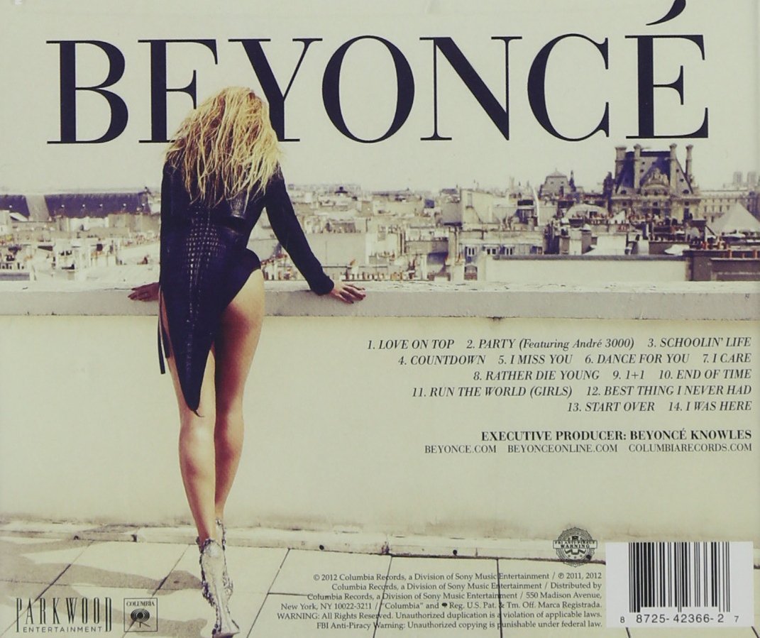 Again, Beyonce's name is a key factor of the digipak - clearly showing the artists name so in turn drawing the correct audience in. An artistic shot on a rooftop creates a scenic view, with an over the shoulder shot of Beyonce with not much clothing, and her iconic long hair emphasises the brand.