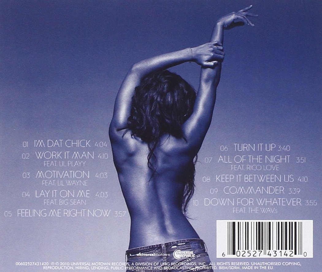 The image used on the back cover portrays Rihanna as very innocent, based on the way she is posing, and looking away from the camera. The red hair is still a key part, but there is a hazy effect which takes away from the raunchiness, possibly displaying another side to the artist. The font colour matches Rihanna's hair colour, and they all mesh well together.