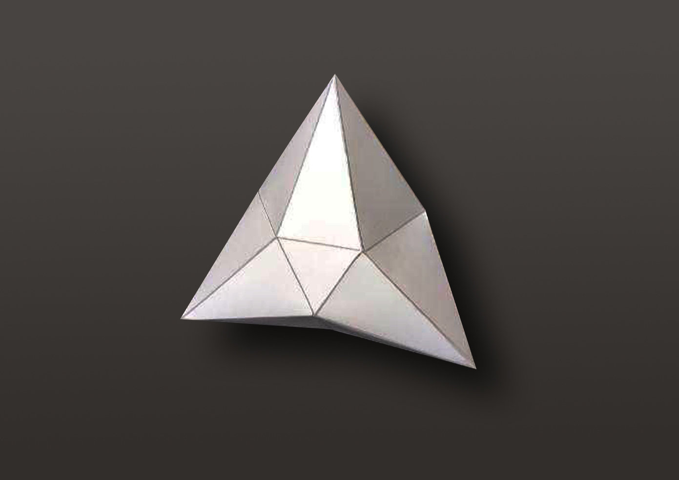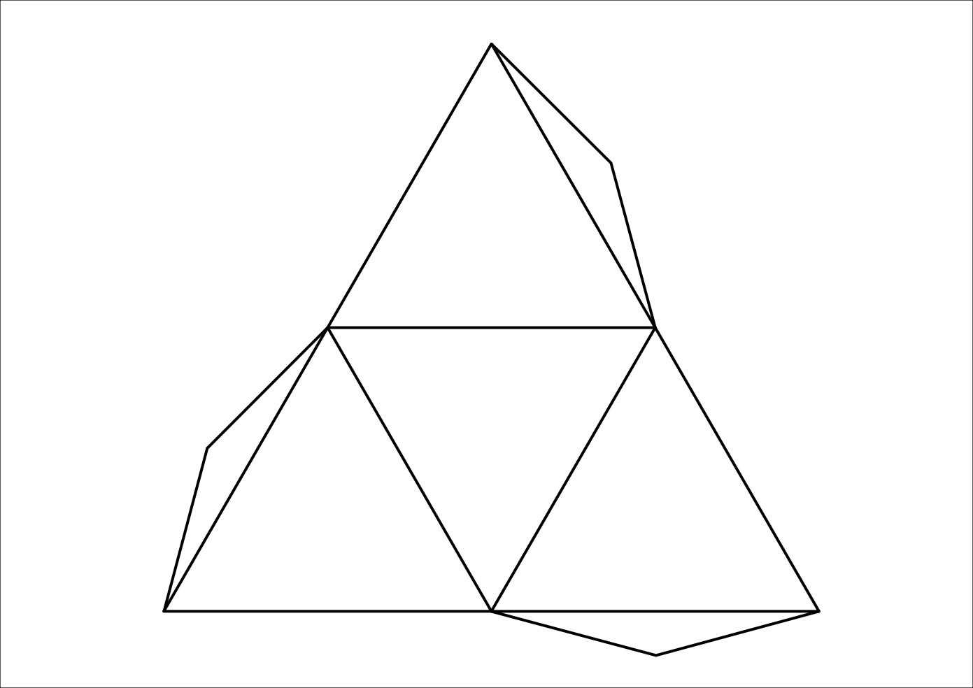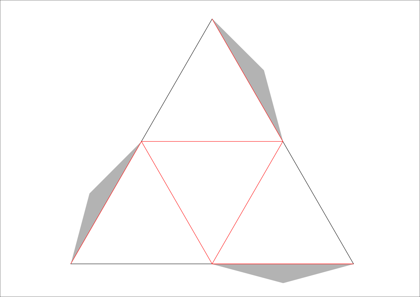На основе чертежа получим развертку тетраэдра. Красные линии соответствуют насечкам, серые треугольники — клапанам, предназначенным для склейки тетраэдра.