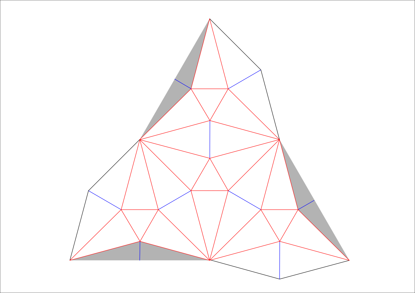 На основе чертежа получим новую развертку. Красные и синие линии соответствуют насечкам на лицевой и тыльной сторонах развертки. Серые треугольники — клапанам, предназначенным для склейки многогранника.