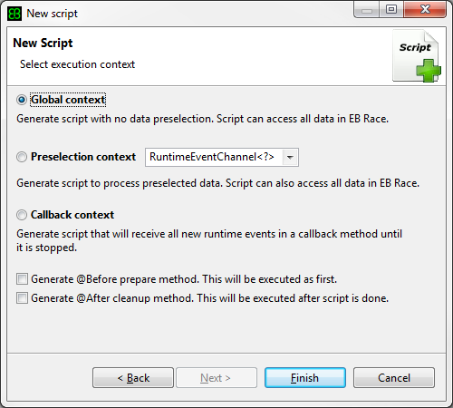 | GLOBAL | The script developer can assume to have access to all events from all channels collected by EB RACE so far. This context is usually chosen in post-mortem analysis. The script is started by the user in the resource explorer and stops when the end of the executable method is reached. It can be stopped explicitly in case it is a long running script. |