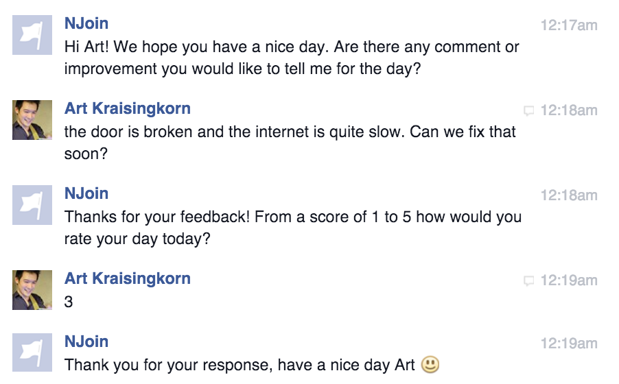 NJoin automatically initiates a checkpoint message asking for any incidence or suggestion from the employees everyday