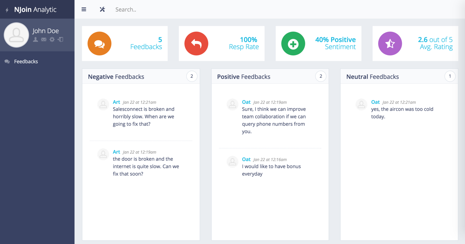 Tam can now open NJoin Analytic dashboard to see response by sentiment and rating
