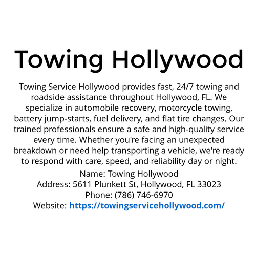 https://towingservicehollywood.com/ Reliable 24/7 towing in Hollywood, FL. We handle jump-starts, tire changes, fuel delivery, motorcycle towing, and roadside emergencies. Book now!