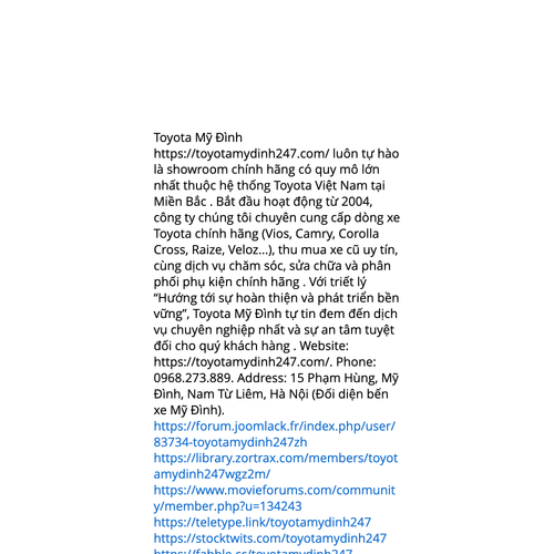 Website: https://toyotamydinh247.com/https://toyotamydinh247.com/ Toyota Mỹ Đình https://toyotamydinh247.com/ luôn tự hào là showroom chính hãng có quy mô lớn nhất thuộc hệ thống Toyota Việt Nam tại Miền Bắc . Bắt đầu hoạt động từ 2004, công ty chúng tôi chuyên cung c