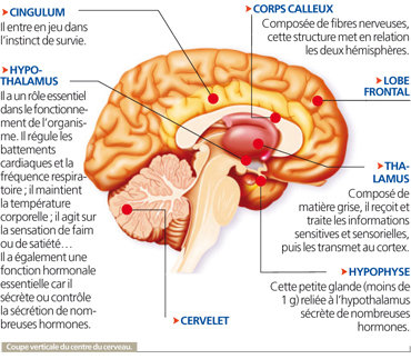 Quant au tronc cérébral, il relie les hémisphères à la moelle épinière et contrôle les fonctions vitales du corps : battement du cœur, respiration, tension artérielle, mouvements du visage, déglutition.