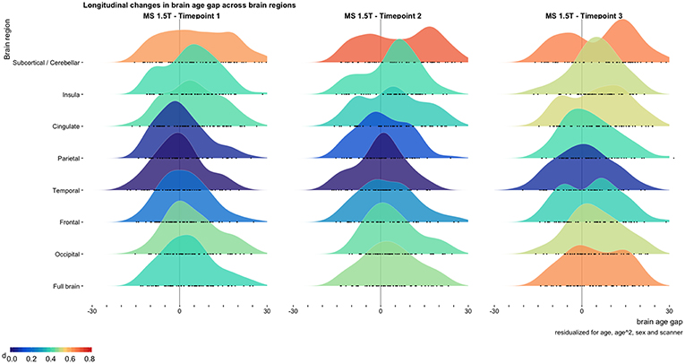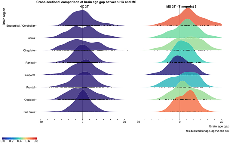 Increased brain age gaps for all brain regions except temporal