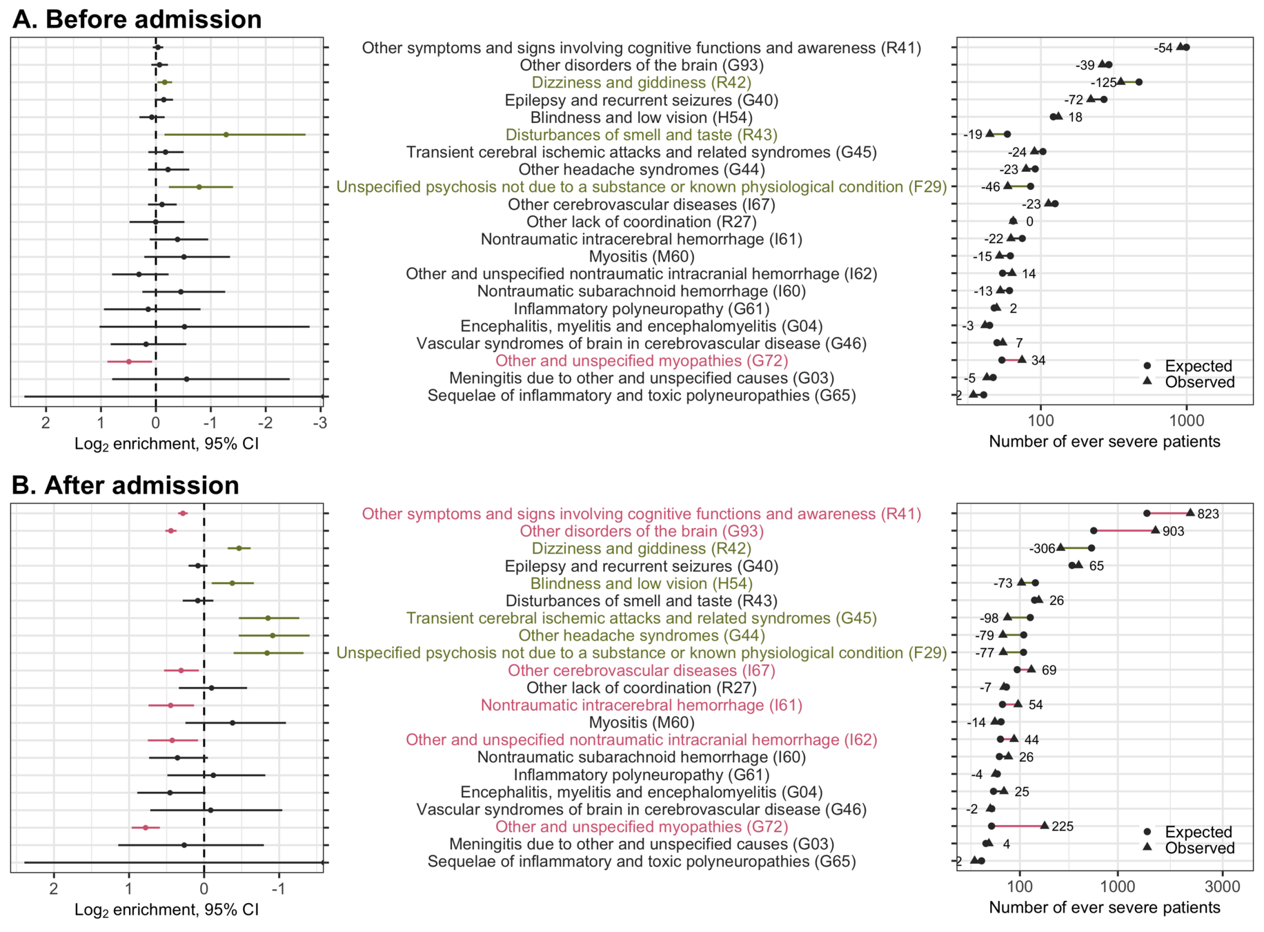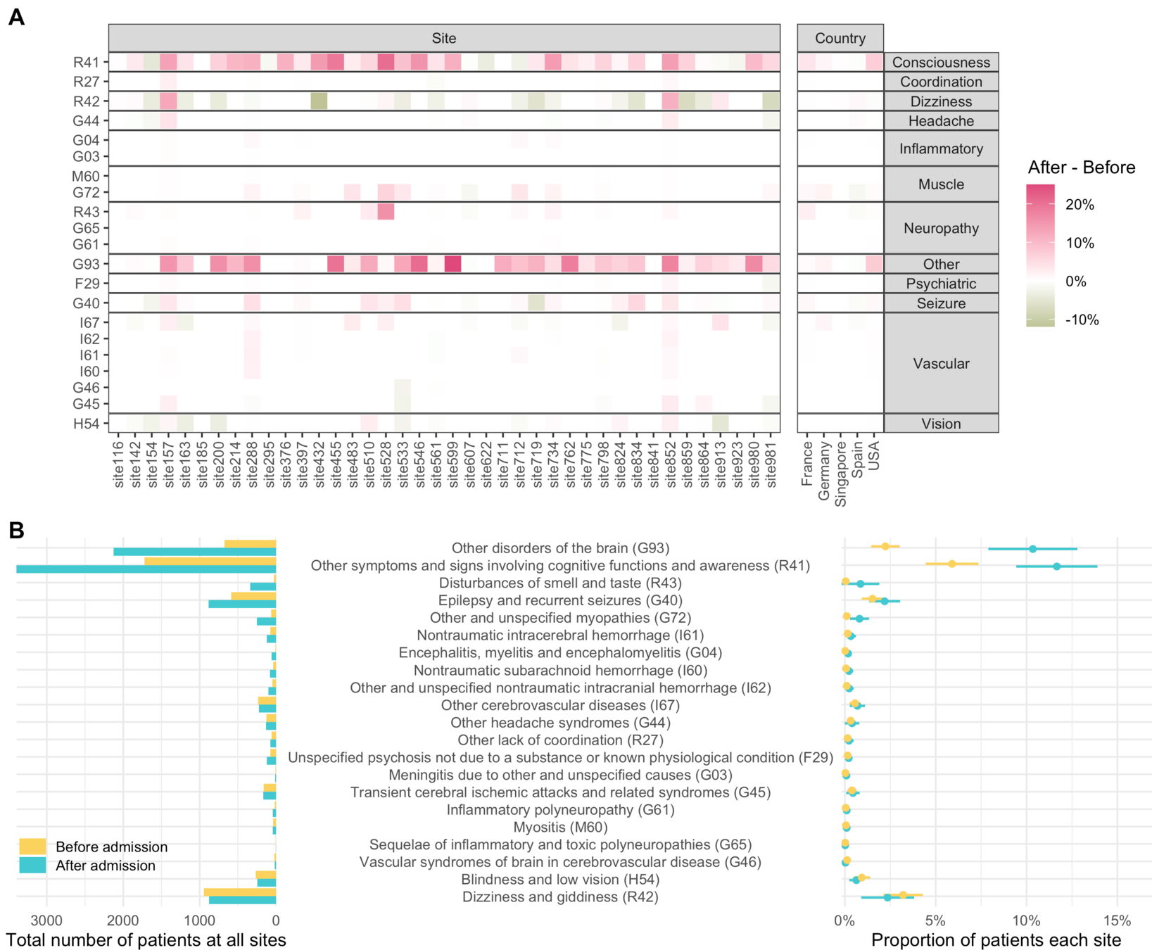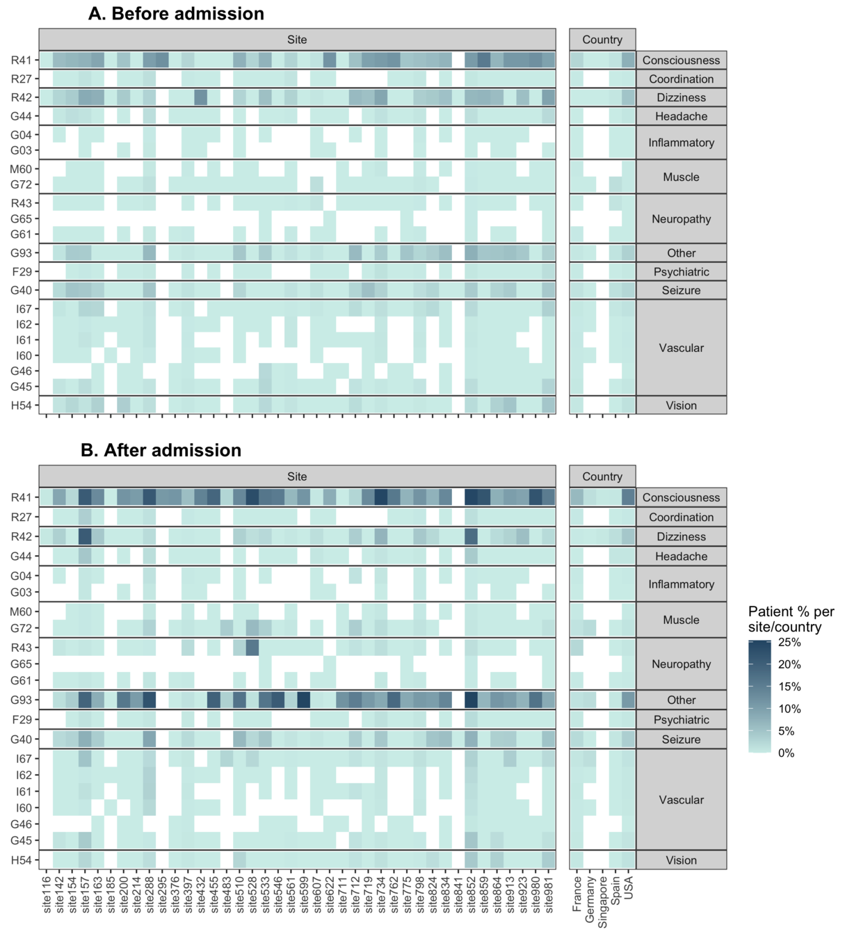 Frequency of each disease category and 3-digit International Classification of Disease (ICD) code of neurological diseases by countries, sites, time before and after admission for COVID-19 related hospitalization, and COVID-19 severity.