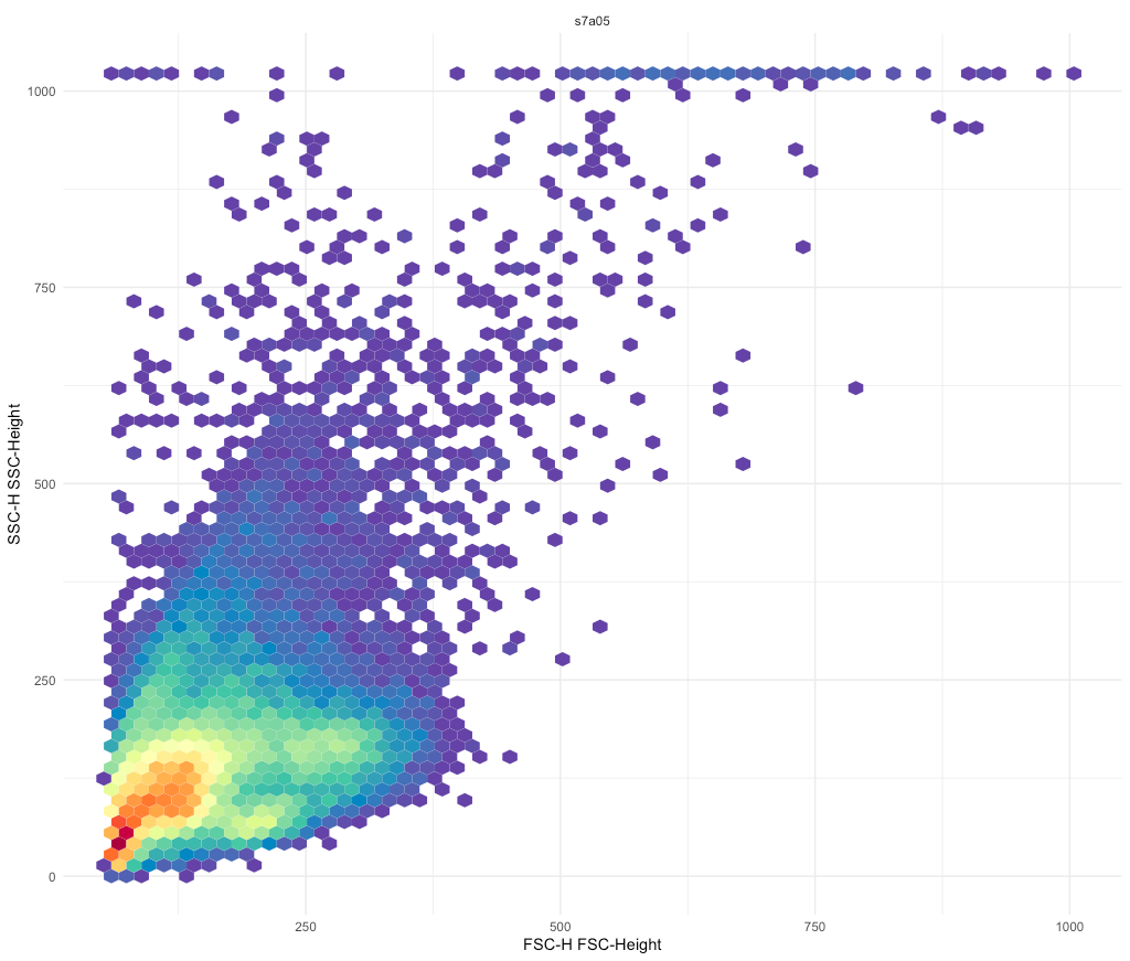 ggcyto::ggcyto() + geom_hex(bins = 64)